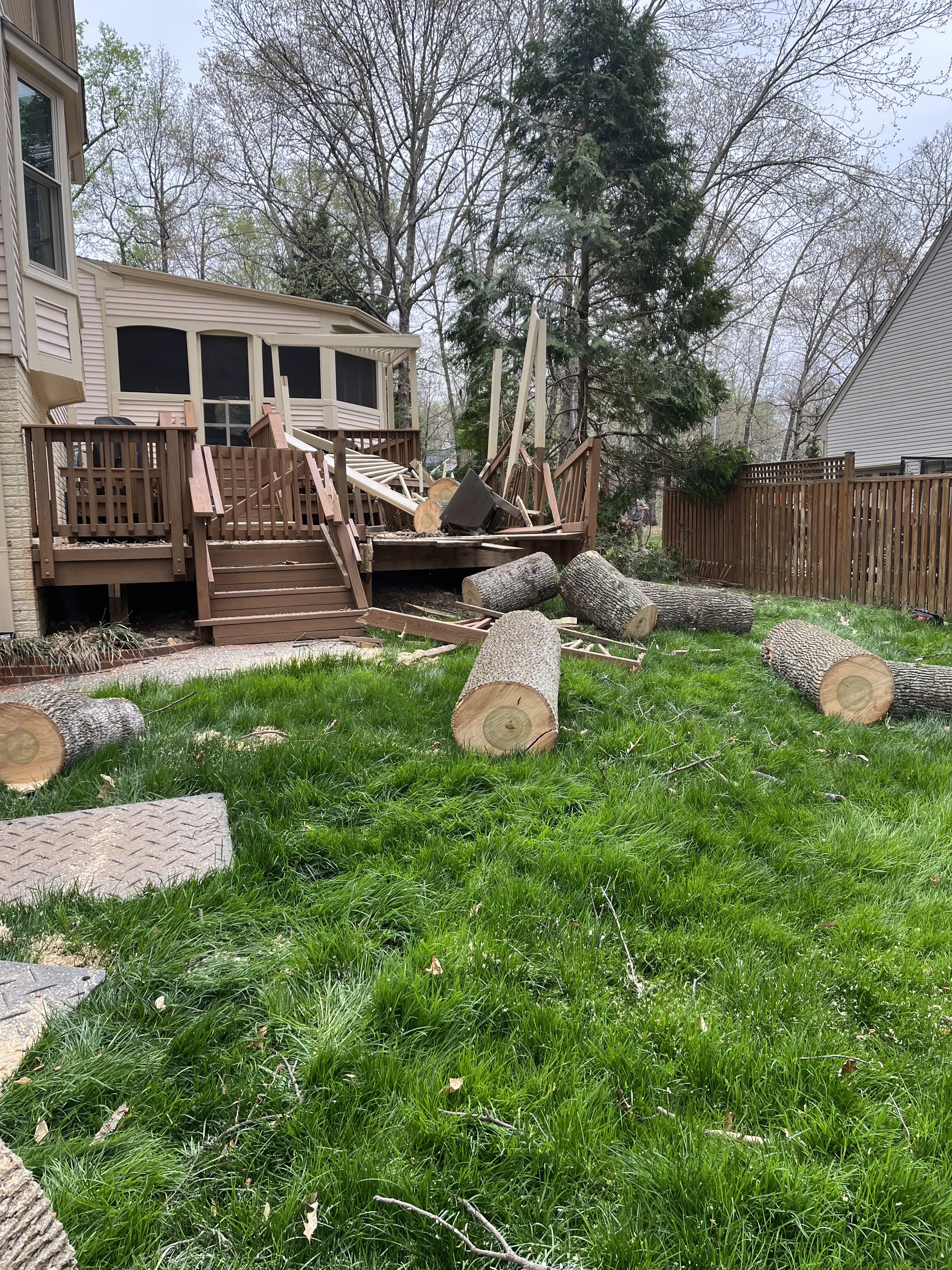Yellow-poplar uprooted and fell on the deck narrowly missing the house. Sometimes there is a silver lining with Storm damage. Tree is gone and now it’s time for some deck repair.