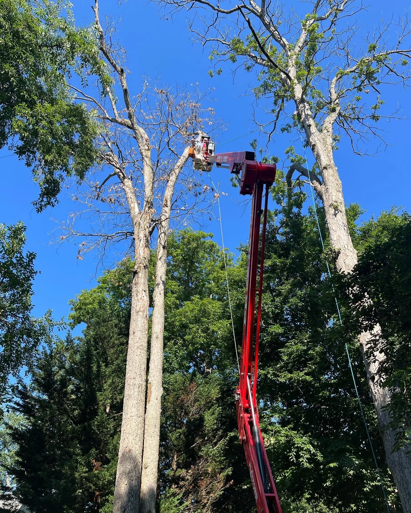Spent Monday and Tuesday tackling these too Oak trees. One was stone dead and the other was about two weeks out from being completely gone. You know there big when a climber has to get them short enough for the 72 foot lift to reach!