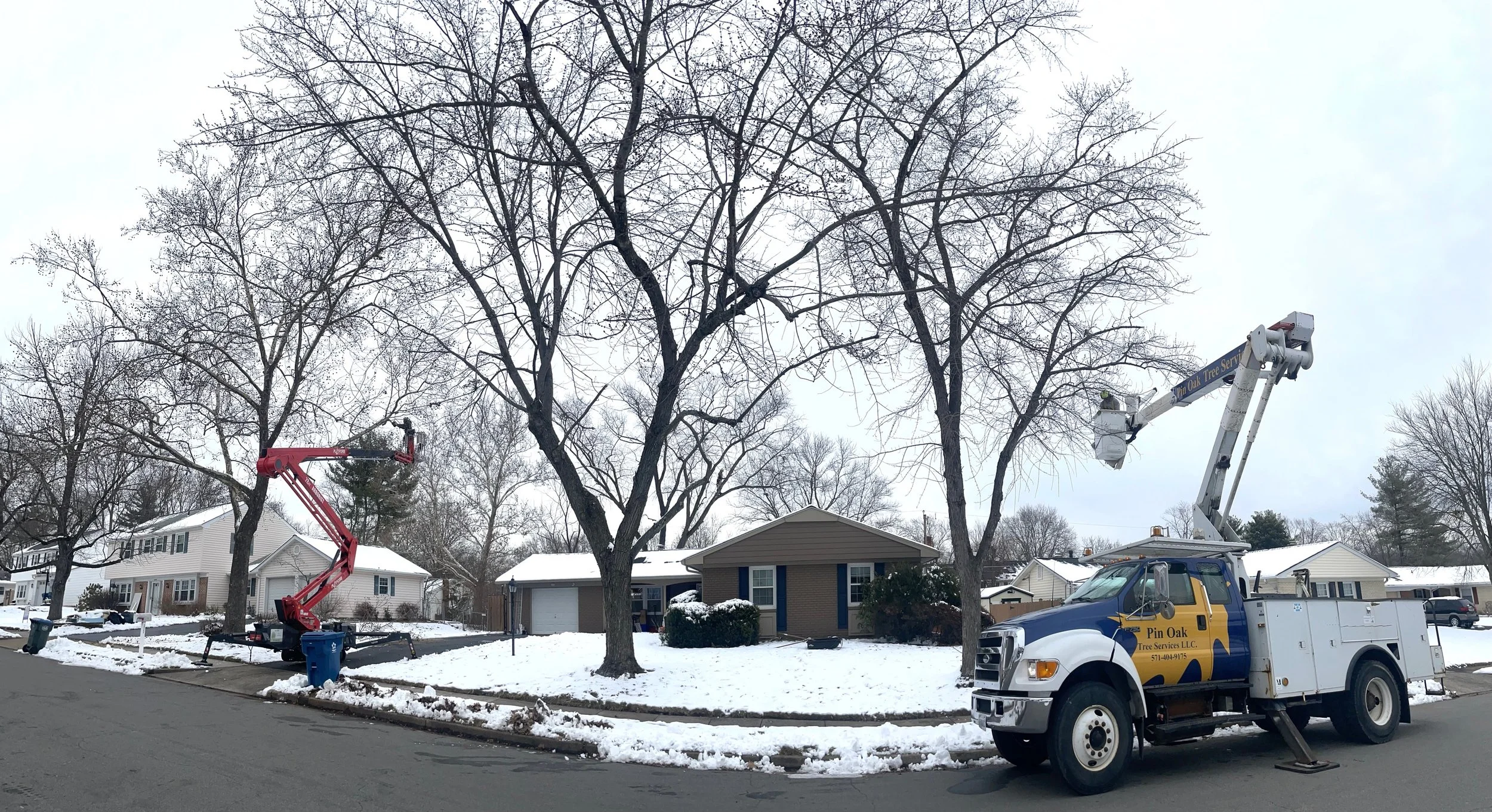 Homeowner took some shots of us while working in the snow the other day. Pruned two Silver Maple trees in the front, one Sycamore in the front and pruned/cabled the Red Maple in the back. Bucket, lift and two climbers all active at the same time.