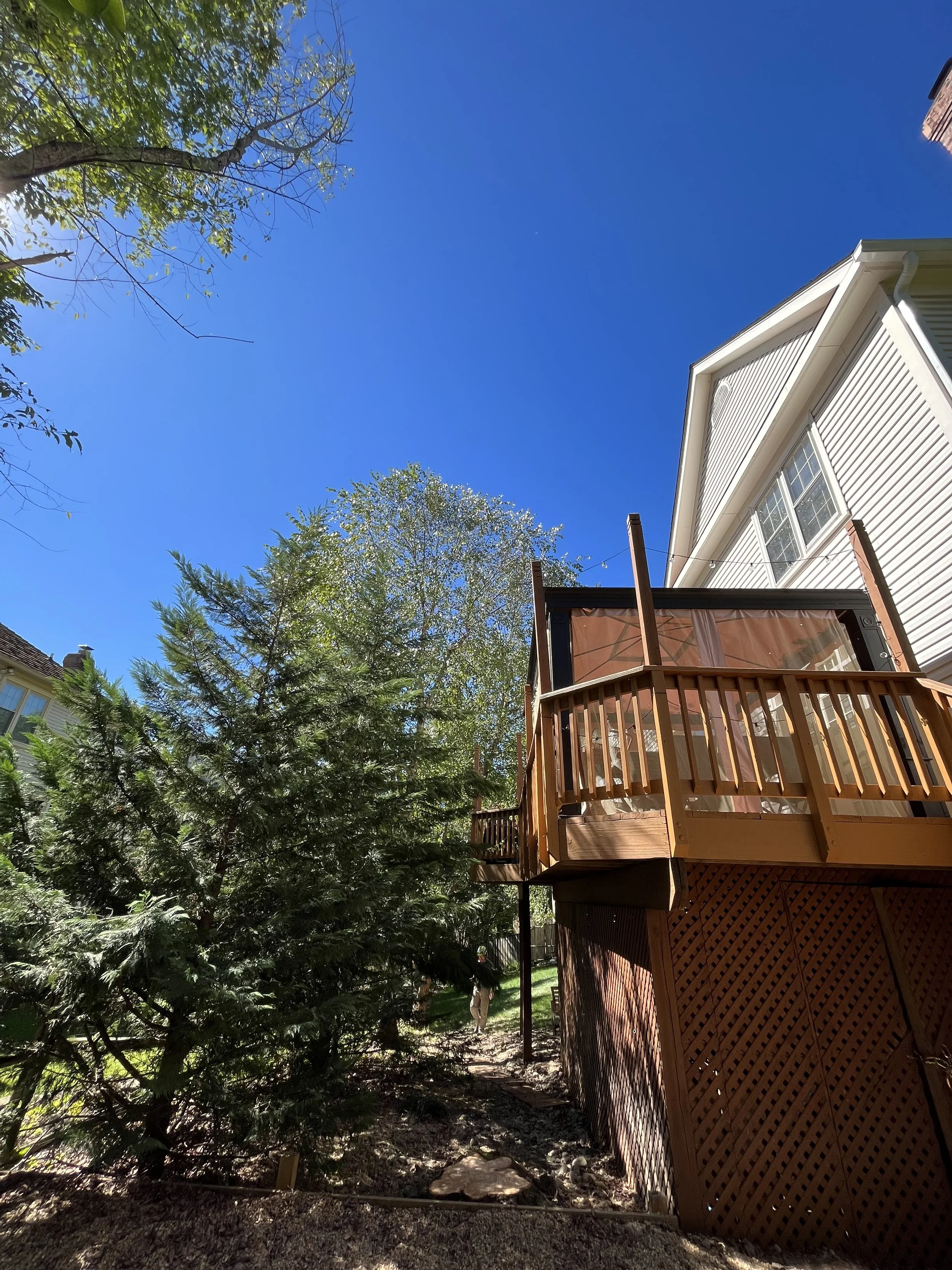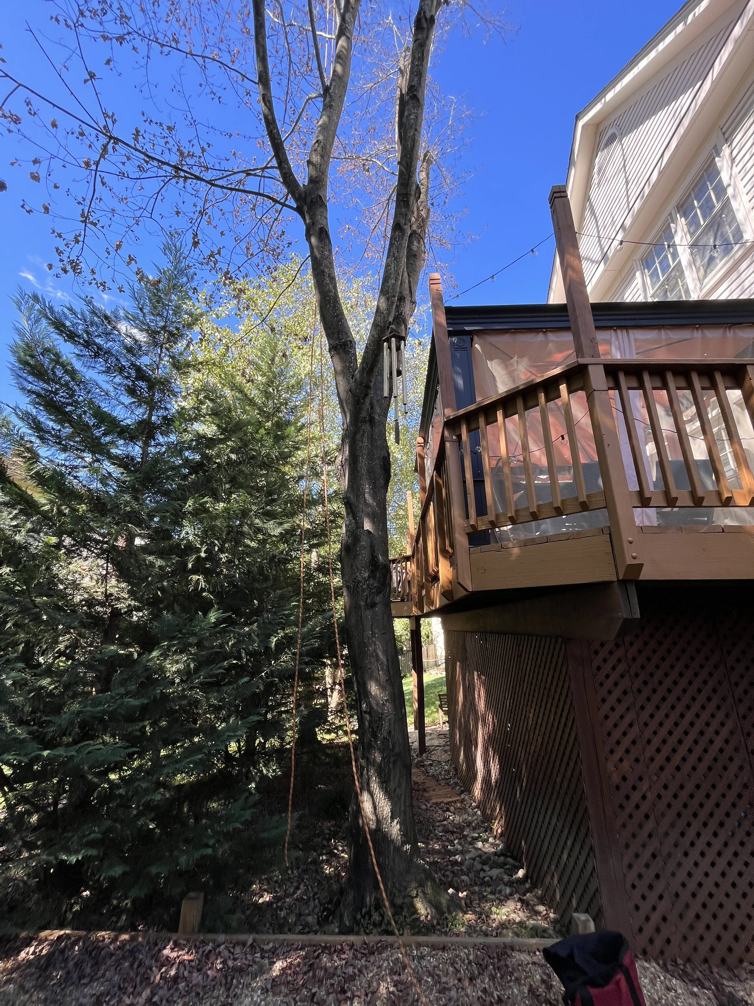 Super tight removal. Over a deck, a permanent tent, string of lights, three Leyland Cypress, a fence and a number of hardscape structures. Slow and steady allowed us to get this done.