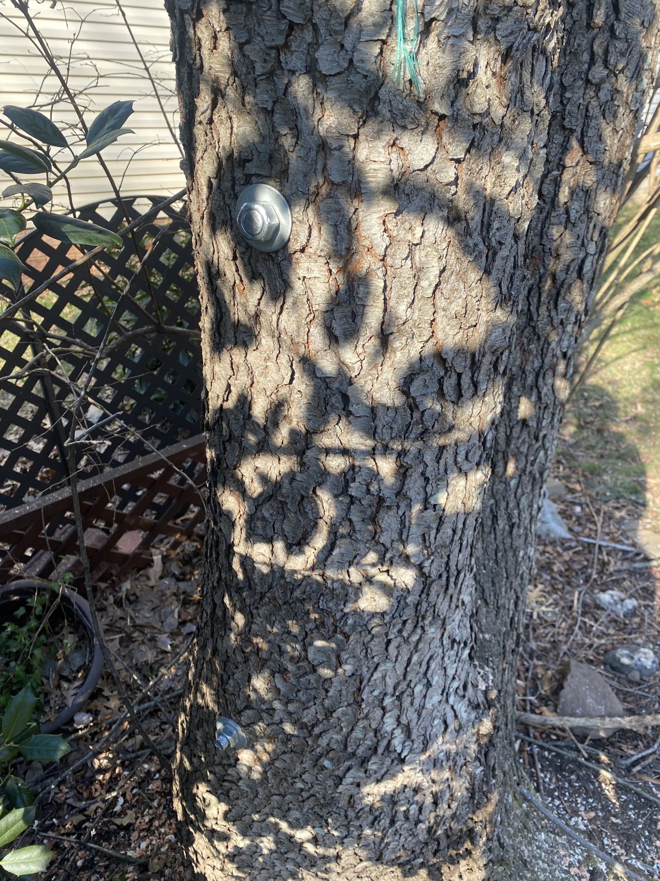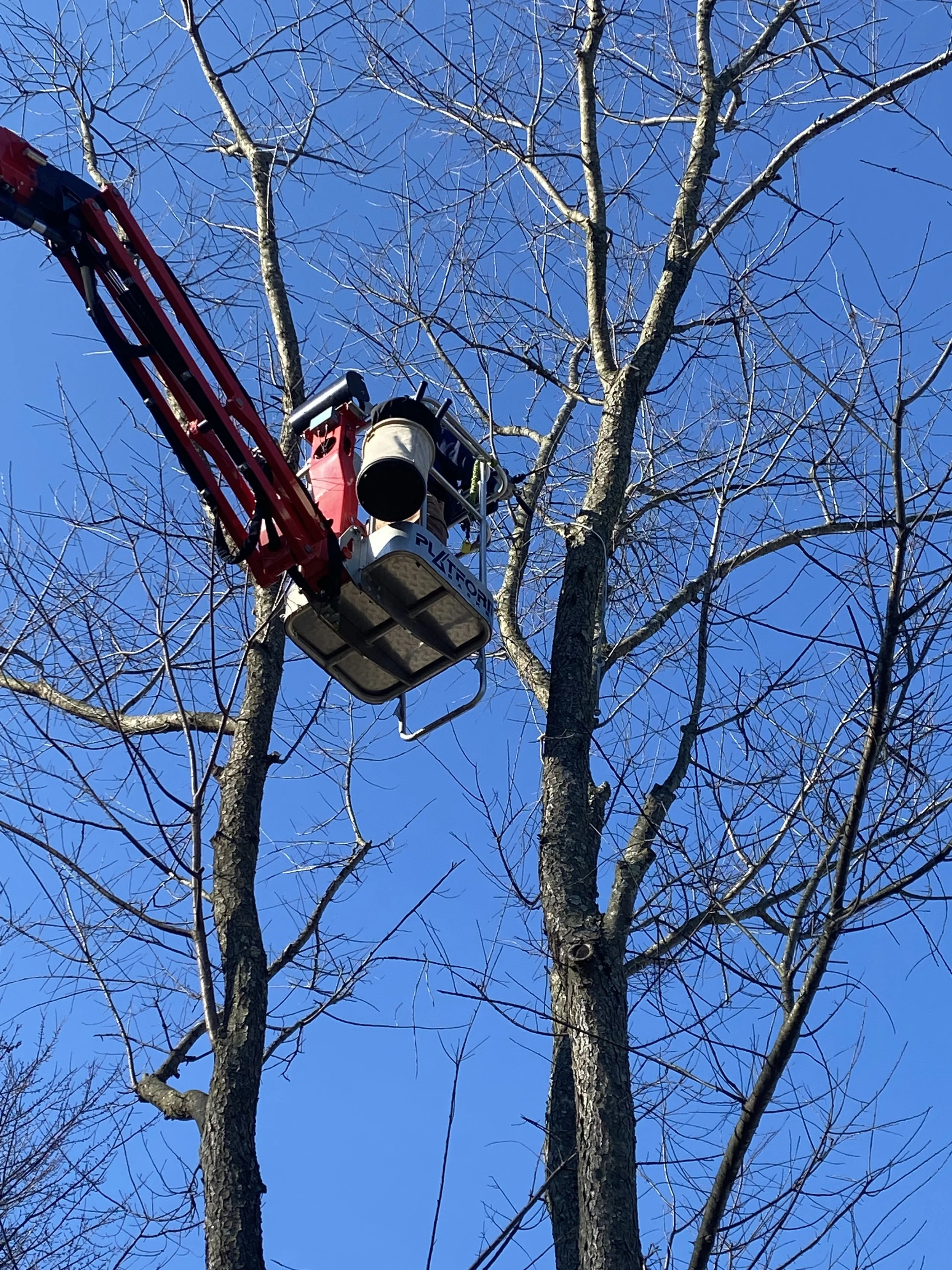 Got some help from ACR Landscape and Tree today with their Spider lift. This is a picture of Tony installing a 1/4 inch EHS steel cabling in a Black Cherry. This support system paired with 5/8 inch steel brace rods decrease the chance of the stems failing. With this support system in place the homeowners can sleep easier.