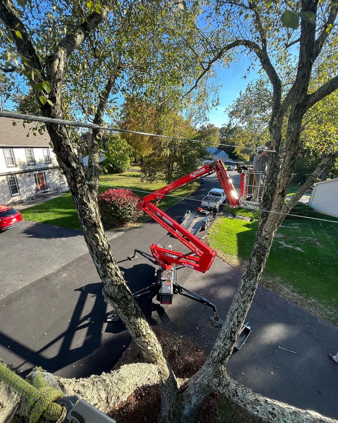 Installed two 1/4 inch EHS (extra high strength) steel cables today in this River birch. The cables will help transfer stress from the main union down to the stump/root area. This is the strongest part of the tree. Cabling is just another support in keeping your trees in whole during wind storms.